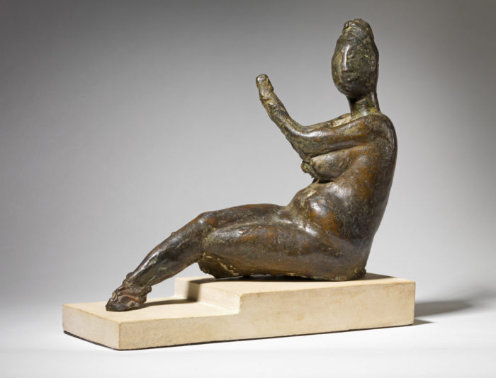 A rare, mid twentieth century bronze model of a ‘Seated Female Nude’ by Marino Marini (Italian, 1901-1980). This bronze was cast under the supervision of the sculptor by the lost wax process in Milan. It is stamped with a monogram ‘M.M.’ and has a dark brown patina with lighter brown highlights.