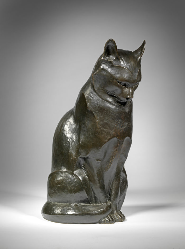 A fine quality, early twentieth century bronze model of a seated cat with long hair entitled ‘Chat, tĂȘte de face’ by Edouard Marcel Sandoz, Swiss (1880-1971). This bronze was produced using the lost wax process at the Valsuani Foundry in Paris. Before casting it was signed and stamped. It has a dark brown patina with lighter brown highlights.