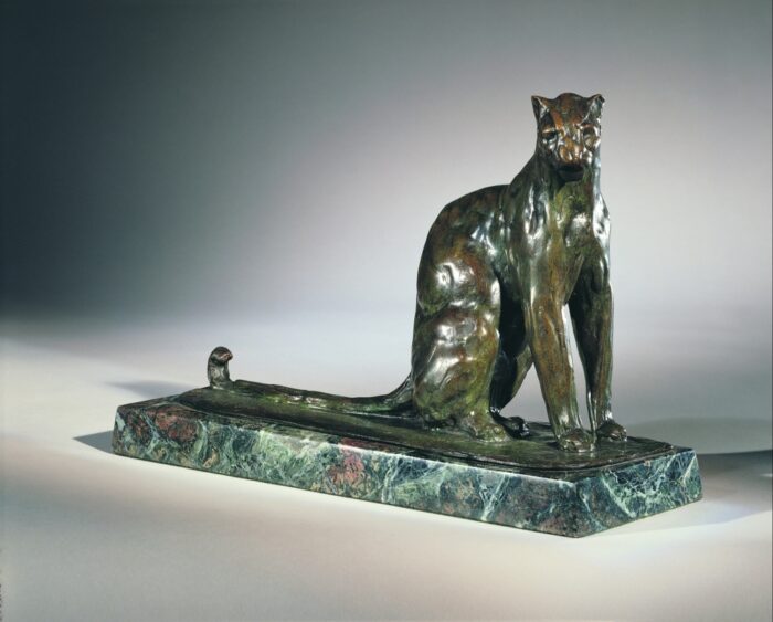 A rare, fine quality, early twentieth century bronze model of a ‘Seated Leopard, Tail Along Base’ by Rembrandt Bugatti (Italian, 1884-1916). This bronze was cast by the lost wax process at the Hébrard Foundry, Paris. Before casting it was signed, numbered and stamped in the wax ‘R. Bugatti’, ‘A.A. Hébrard Cire Perdue’. This cast has a medium brown and green patina with dark brown undertones and golden highlights.
