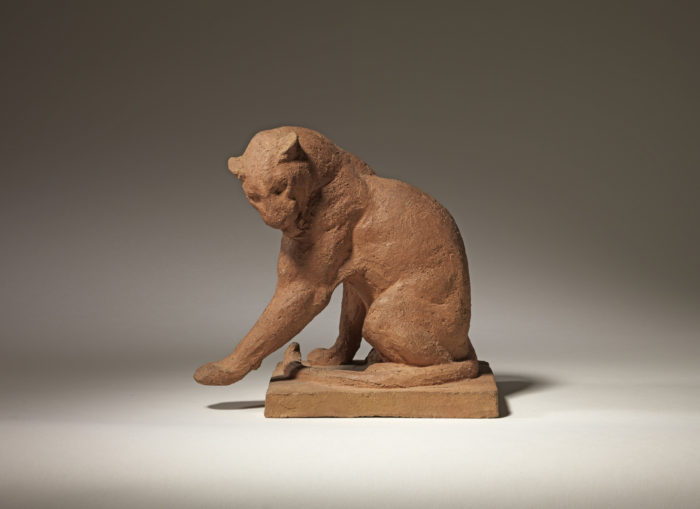 A fine quality, early twentieth century original terracotta model of a ‘Panther Grooming’ by Charles Delhommeau (French, 1883-1970). This model is signed ‘C. Delhommeau’.