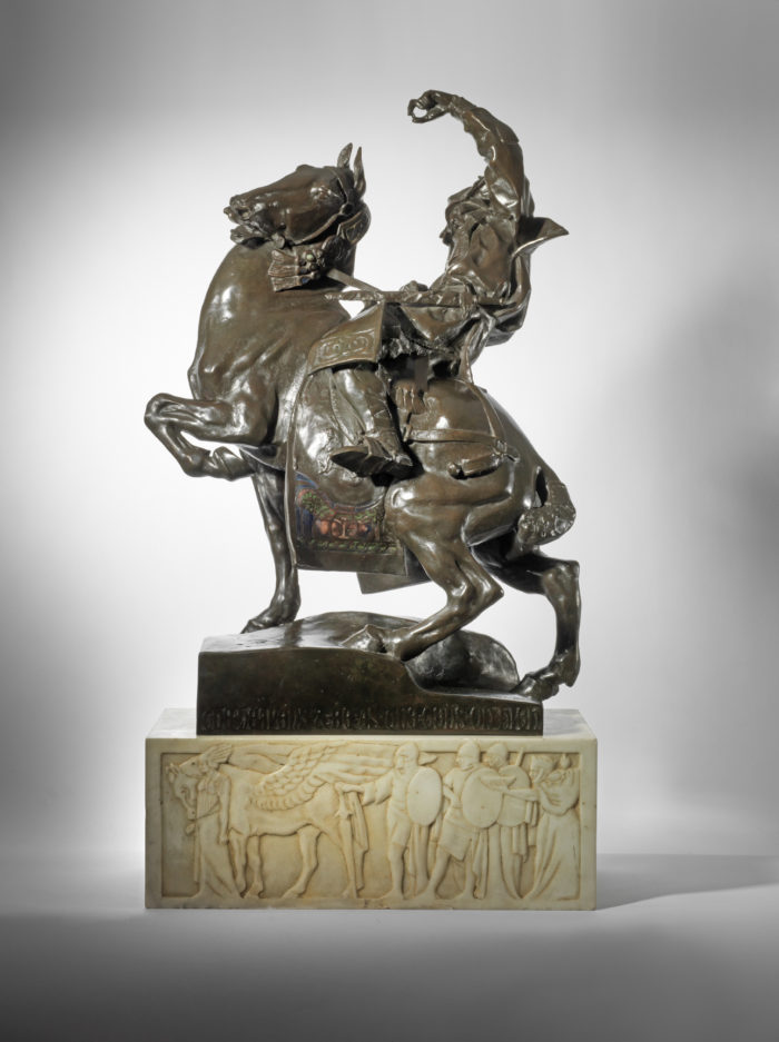 A fine quality early twentieth century bronze model of ‘Sigurd with Ring’ by Gilbert Bayes (English, 1872-1953). This bronze, signed ‘Gilbert Bayes’ has a rich brown patina with multi-coloured enamelling and is mounted on its original carved marble base which depicts scenes from the saga on which the sculpture is based.
