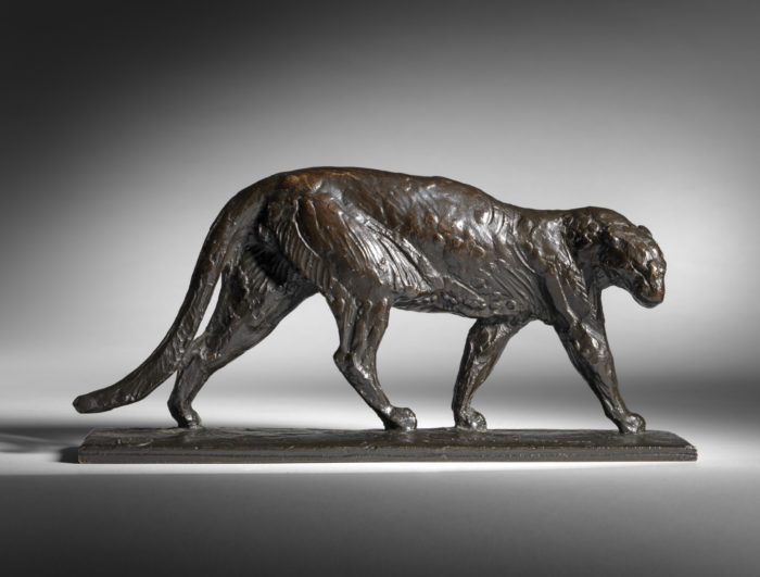 A fine quality, early twentieth century bronze model of a ‘Small Walking Panther’ by Albéric Collin (Belgian, 1886 – 1962). This sculpture was cast in bronze using the lost wax process at the Claude Valsuani Foundry, Paris. Before casting it was signed and stamped in the wax: ‘Albéric Collin’ and ‘C. Valsuani Fondeur Cire Perdue.’ It has a warm brown patina with golden undertones.
