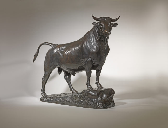 A fine quality, rare nineteenth century bronze model of a ‘Walking Bull’, by Isidore Bonheur (French, 1827 – 1901). This bronze was cast in Paris. Prior to casting it was signed I. Bonheur’. This cast has a dark brown patina with golden highlights.