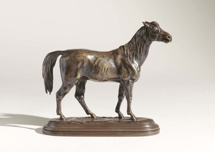 A fine quality, rare, nineteenth century bronze model of a ‘Standing Stallion’ by Isidore Bonheur (French, 1827 – 1901). This bronze, signed ‘I Bonheur’ and stamped by the Peyrol Foundry, France was cast by the sand casting process and has a medium brown patina with golden highlights.