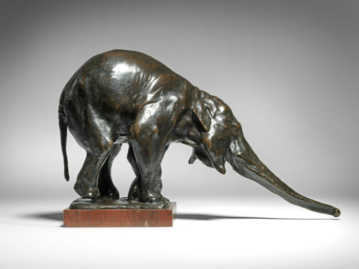 A fine quality, early twentieth century bronze model of a ‘Stretching Elephant’ entitled ‘Il y arrivera’ by Rembrandt Bugatti (Italian, 1884-1916). This bronze was produced using the lost wax casting process at the Hebrard Foundry, Paris. Prior to casting it was signed, stamped and inscribed in the wax. It has a dark brown patina with lighter reddy bronze undertones.