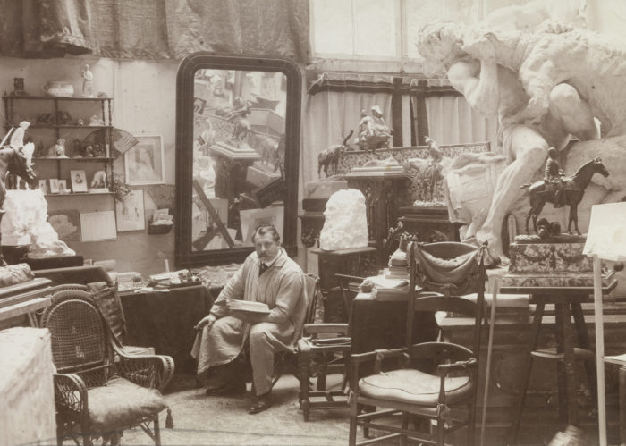 A historical photograph of the artist Jacques Froment-Meurice in his studio.
