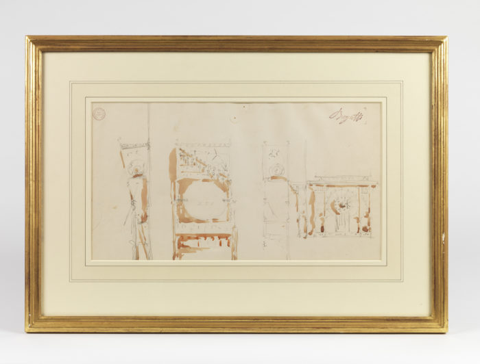 A fine quality, early twentieth century drawing in pencil with reddy brown wash of ‘Three Studies for Furniture Designs’ by Carlo Bugatti (Italian, 1856-1940). This work on paper bears a stamp of the artist’s signature ‘Bugatti’.