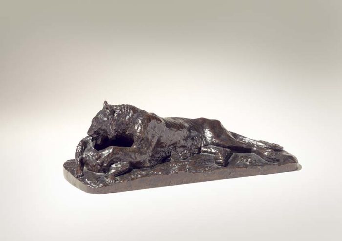 A fine quality early nineteenth century bronze model of a ‘Tiger and prey’, in this case a monkey. This bronze, signed ‘FRATIN’ and stamped by the foundry ‘Quesnel’. This cast has a dark brown patina with black undertones.