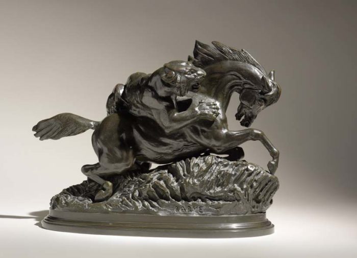 A fine quality, nineteenth century bronze model of a ‘Tiger attacking a Horse’ by Antoine-Louis Barye (French, 1796-1875). This bronze, signed ‘BARYE’, was cast by the Susse Foundry in Paris. It has a dark brown and black patina with red and green undertones.