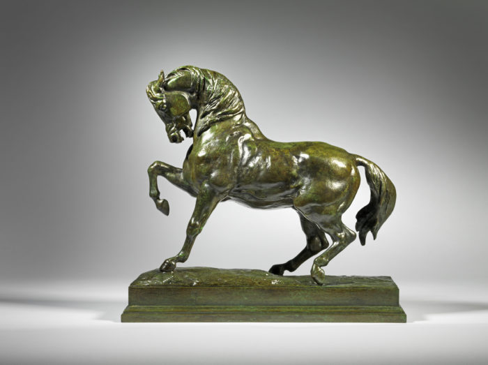 A fine quality, nineteenth century bronze model of a ‘Turkish Horse with its right leg raised’ by Antoine-Louis Barye (French, 1795-1875). This bronze was produced using the sand casting process at the Brame foundry. It is signed ‘Barye’ and inscribed with the letter ‘H’ of the Maison Brame. It has the typical ‘feuille d’automne’ green and brown patina.