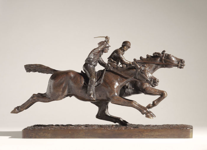 A fine quality mid nineteenth century bronze model of ‘Two Jockeys and Racehorses’ by Christophe Fratin (French, 1800-1864). This bronze, signed with the sculptors stamp ‘Fratin’ with the reverse N, has a dark brown patina with black in the depths and golden highlights.