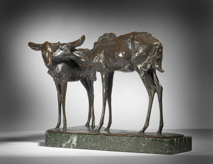 A rare, fine quality, early twentieth century bronze model of two Kudu antelopes ‘Au Repos’ by Rembrandt Bugatti (Italian, 1884-1916). This sculpture was cast in bronze using the lost wax process at the Hébrard Foundry, Paris. Before casting it was signed, inscribed, numbered and stamped in the wax. This cast has a dark brown to black patina.