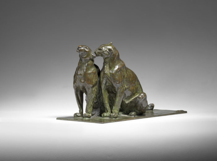 A good quality, early twentieth century bronze model of ‘Two Leopards’ by Thierry Van Ryswyck (Belgian, 1911-1958). This bronze was produced using the lost wax process at the Batardy Foundry, Brussels. Prior to casting it was signed and inscribed in the wax ‘Th. Van Ryswyck’, ‘Batardy Bruxelles cire perdue’. It has a golden brown and green patina with golden highlights.