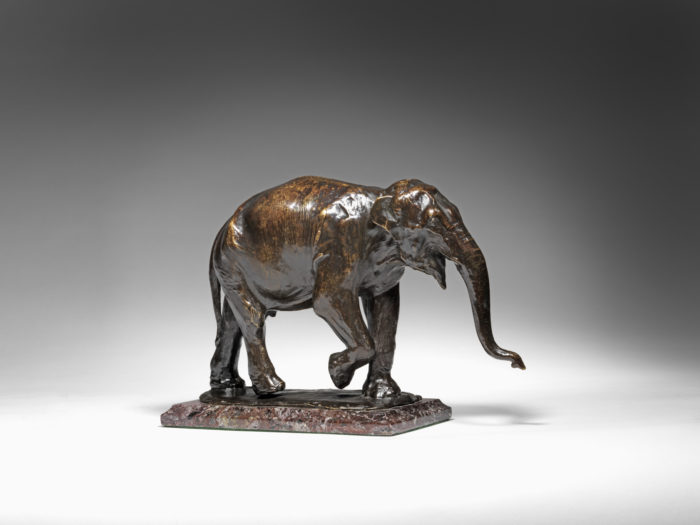A rare, fine quality, early twentieth century, impressionistic bronze model of a ‘Walking Indian Elephant’ by Rembrandt Bugatti (Italian, 1884-1916). This bronze was cast using the lost wax process by the Hébrard Foundry, Paris. Prior to casting it was signed, numbered and stamped in the wax. This cast has a rich dark brown and black patina with lighter reddy brown undertones.