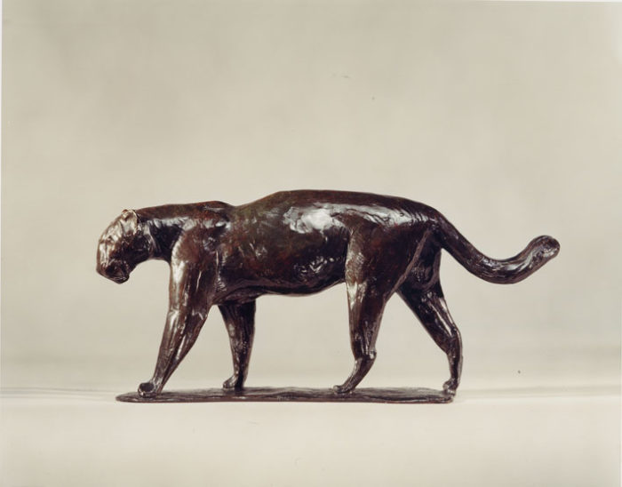 A rare, fine quality, early twentieth century bronze model of a ‘Petit Jaguar Marchant’, by Rembrandt Bugatti, (Italian, 1884-1916). This bronze was cast by the lost wax process at the Hébrard Foundry, Paris. Before casting it was signed, stamped and numbered in the wax. This cast has a rich dark brown patina with golden highlights.