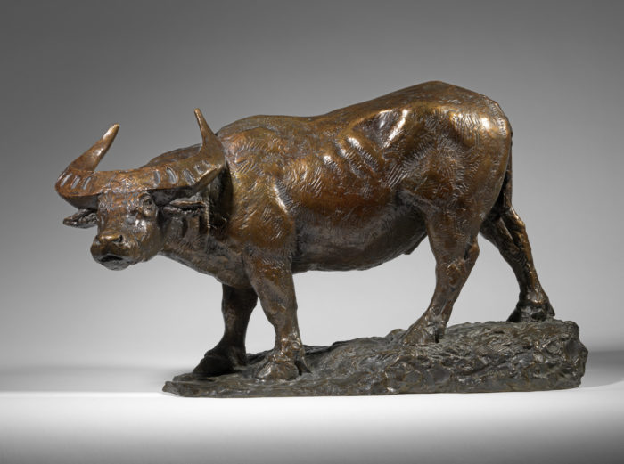 A mid twentieth century bronze model of a ‘Water Buffalo’ by Roger Godchaux (French, 1878-1958). This bronze was produced by the lost wax process. Prior to casting it was signed and inscribed in the wax ‘Roger Godchaux’. It has a brown patina with red and gold highlights.