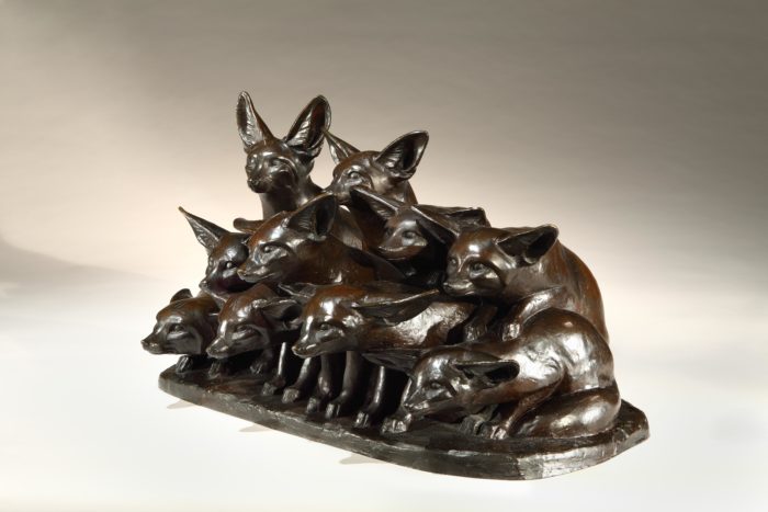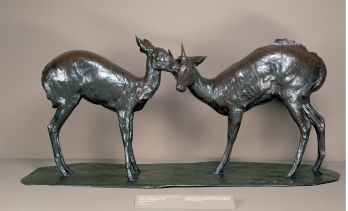A piece of note is ‘Mes Antilopes’ by Rembrandt Bugatti which is his only finished life-size work, measuring over two metres in length. Bugatti convinced the director of the Antwerp Zoo to have the two, live animals shipped to Paris, where they lived with Rembrandt Bugatti in his studio – a project which testifies to the great trust which the institution had for the artist. Bugatti was profoundly attached to the two antelopes and the work depicts the affection between the animals, who had endured a long journey, confined in a crate, and were reportedly unsettled for a while after their arrival in Paris. As is often evident in Bugatti’s work, he depicts the vulnerability of these animals, who contrast sharply with his own sense of loneliness.