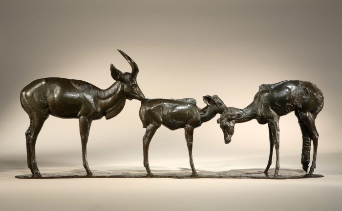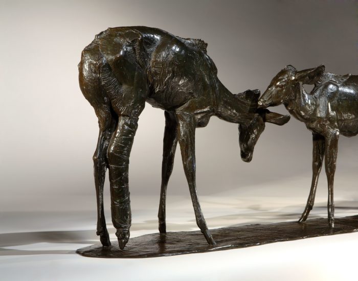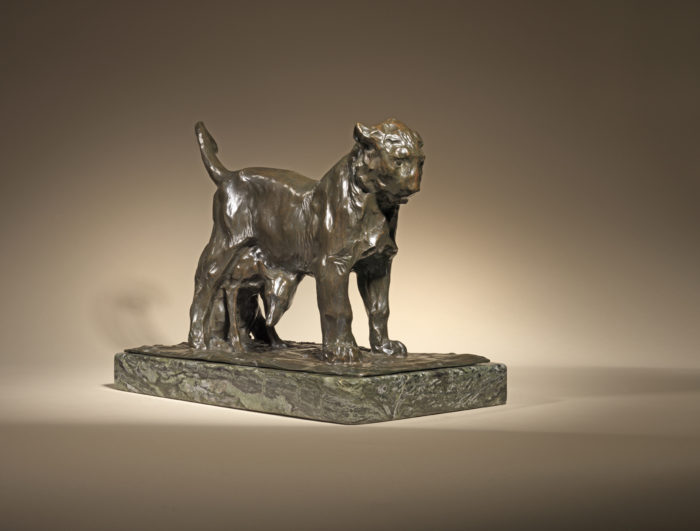 All seventeen sculptures featured depict pairs or family groups of animals and have been generously loaned by collectors both in the UK and abroad. Works have been chosen to illustrate the sculptor’s unique ability to capture the attitudes and emotion of his subjects and demonstrate the unusual empathy he had for all creatures. Bugatti conveyed a true sense of tenderness between beasts, both amongst the same species, like the antelopes in ‘La Mère Blessée’ or peculiar mismatches like the unique ‘Lion Cub and Greyhound’, telling of the affection developed between the Greyhound adoptive mother of Atlas, an orphaned lion cub.